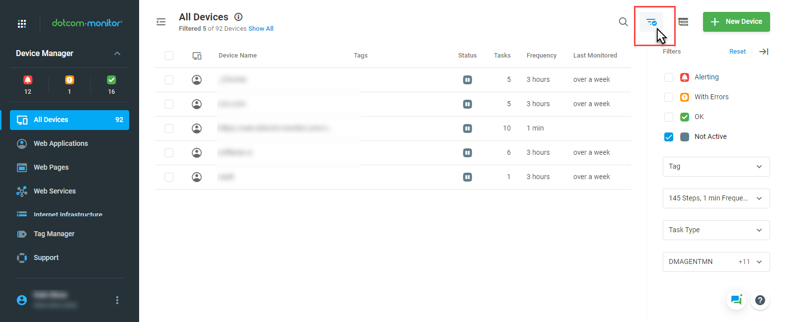 Lorsque vous créez un périphérique, un filtre par défaut est automatiquement appliqué à tous les appareils. Le filtre par défaut exige que plus d'un emplacement (sauf si vous ne sélectionnez qu'un seul emplacement) reçoive l'erreur avant qu'une alerte ne soit déclenchée. Ceci est fait pour éliminer les fausses alertes positives lorsqu'un emplacement souffre d'un petit hoquet réseau. Vous pouvez créer un filtre qui ne nécessite pas plus d'un emplacement, mais sachez que vous recevrez probablement de nombreuses fausses alertes positives en raison de la nature incontrôlée du trafic sur Internet.