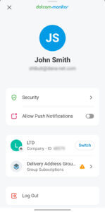 To access the user profile menu, tap the profile icon displayed within the top action menu. You can switch between accounts, manage push notifications and subscriptions to notification groups, and set up a PIN for the app from the menu.