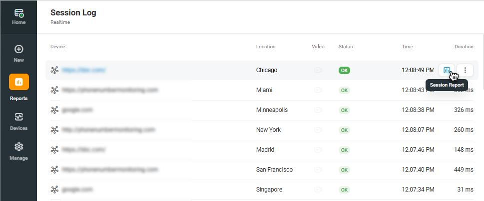 The Session Log is an interactive dashboard that displays a real-time log of monitoring sessions that are executed in your account. Session data is provided for the most recent 100 monitoring sessions and is continually updated in real-time. The sessions are displayed in the order they have been executed and include all monitoring locations. Within the Session Log, you can find various monitoring session information, such as the name of a corresponding device, the related monitoring location, the status of the device, error details (if detected), and response time duration, etc.