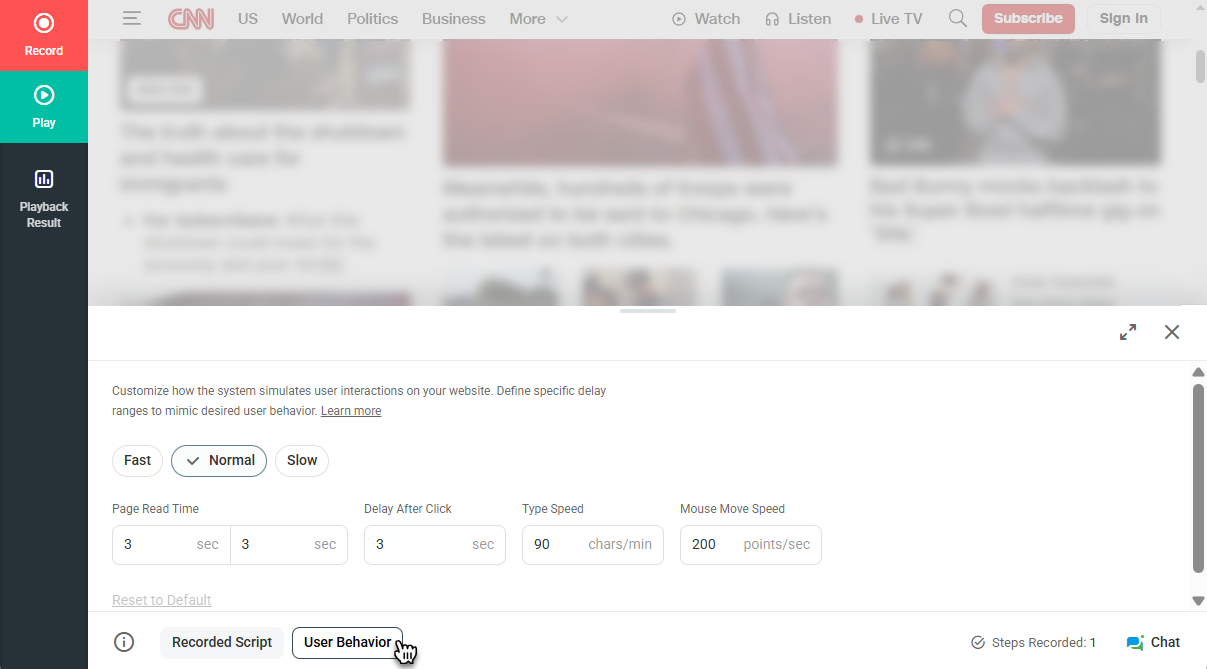 - Slow – Adds a 7-second delay between actions to simulate a slower user experience on the target website.